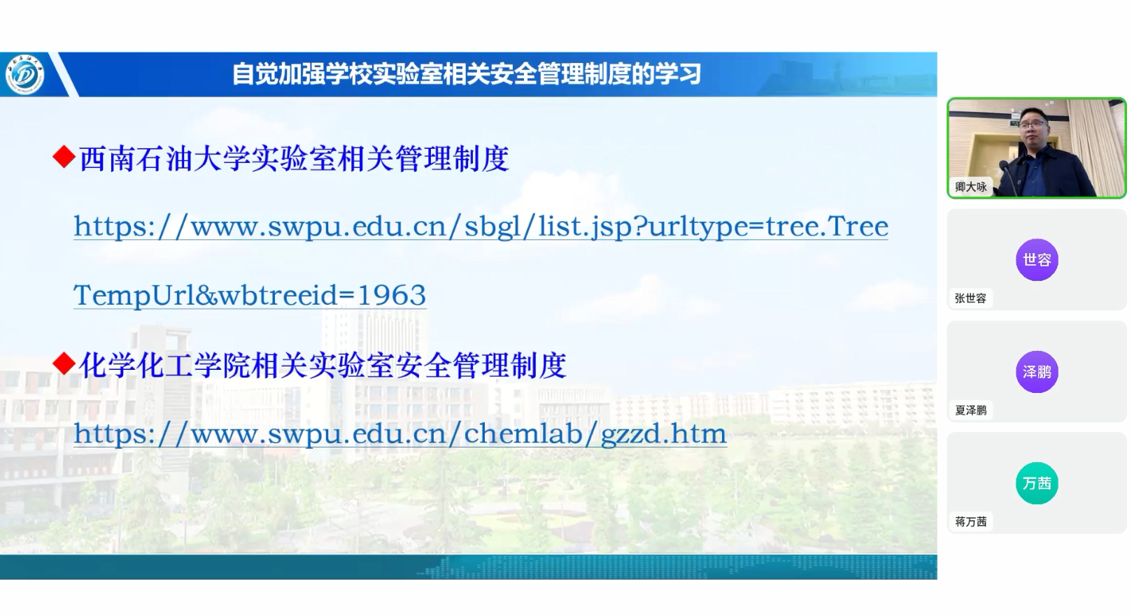 根据学校系列实验室安全通知精神,结合学院2024年实验室安全管理工作要求和安排,化工院于3月7日晚上在思学楼A114举办针对各研究室及全体研究生的实验室安全教育讲座,并采用飞书会议全程同步直播,学院要求各课题组做好安排、暂停实验,组织全体学生线下学习或各课题组在线集中学习。