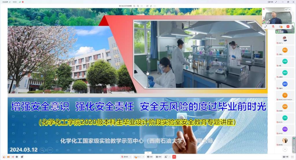 该讲座主要通过讲解“本科生实验室安全准入要求”、“解读相关安全承诺制度要求”、“解读学校《实验室安全知识手册》”、“掌握实验室风险识别”、“实验室个体防护要求”、“2020级本科生毕业设计期间实验安全要求”培养深化2020级本科毕业生的实验安全意识,会后卿老师留出时间供同学们交流讨论,通过本次讲座学生们收获颇丰。本次讲座同时通过飞书会议全程进行直播,讲座结束后学院将会议全程录播视频和学生参会情况统计表发到学院安全管理群里,要求各实验室负责人核实进入其实验室的学生是否进行了该专题安全学习,若未参会学习的请实验室负责人或指导教师一定组织对应学生再次进行学习,并经指导教师同意后才能进实验室开展实验,未参加者不得进入实验室!
