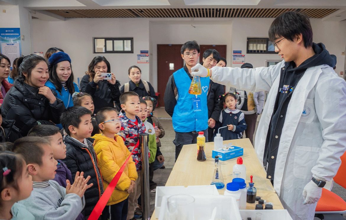 11月29日,化学化工国家级实验教学示范中心(西南石油大学)迎来67名校友子女返校参加研学活动,孩子们在6岁至15岁的年龄段,实验中心朱鹏飞、刘莹、马丽华老师带领化学协会同学通过“大象牙膏”“彩色喷泉”“手工皂制作”等趣味化学实验项目,体验了一场别开生面的科学探索之旅。