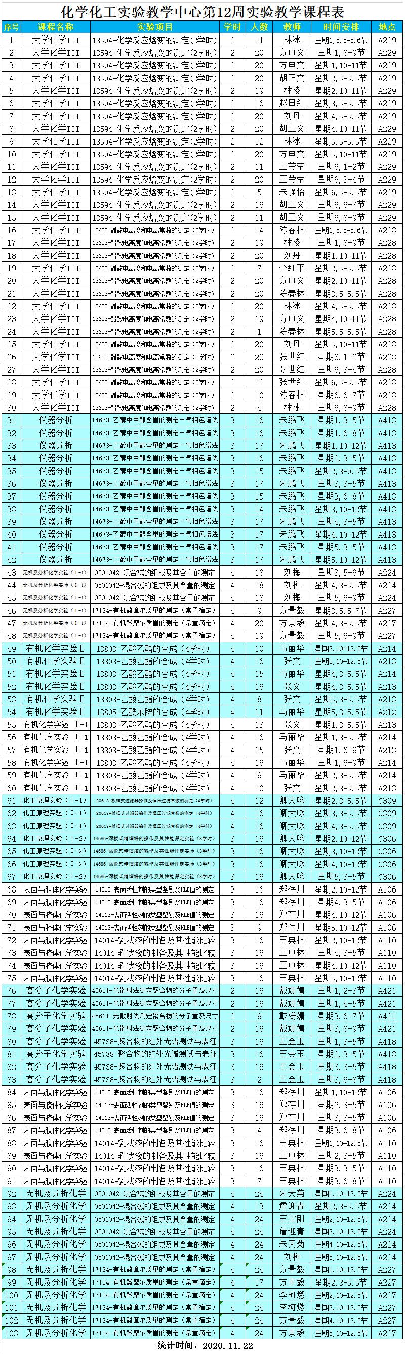 2020年秋季化学化工实验教学中心第12周实验教学安排