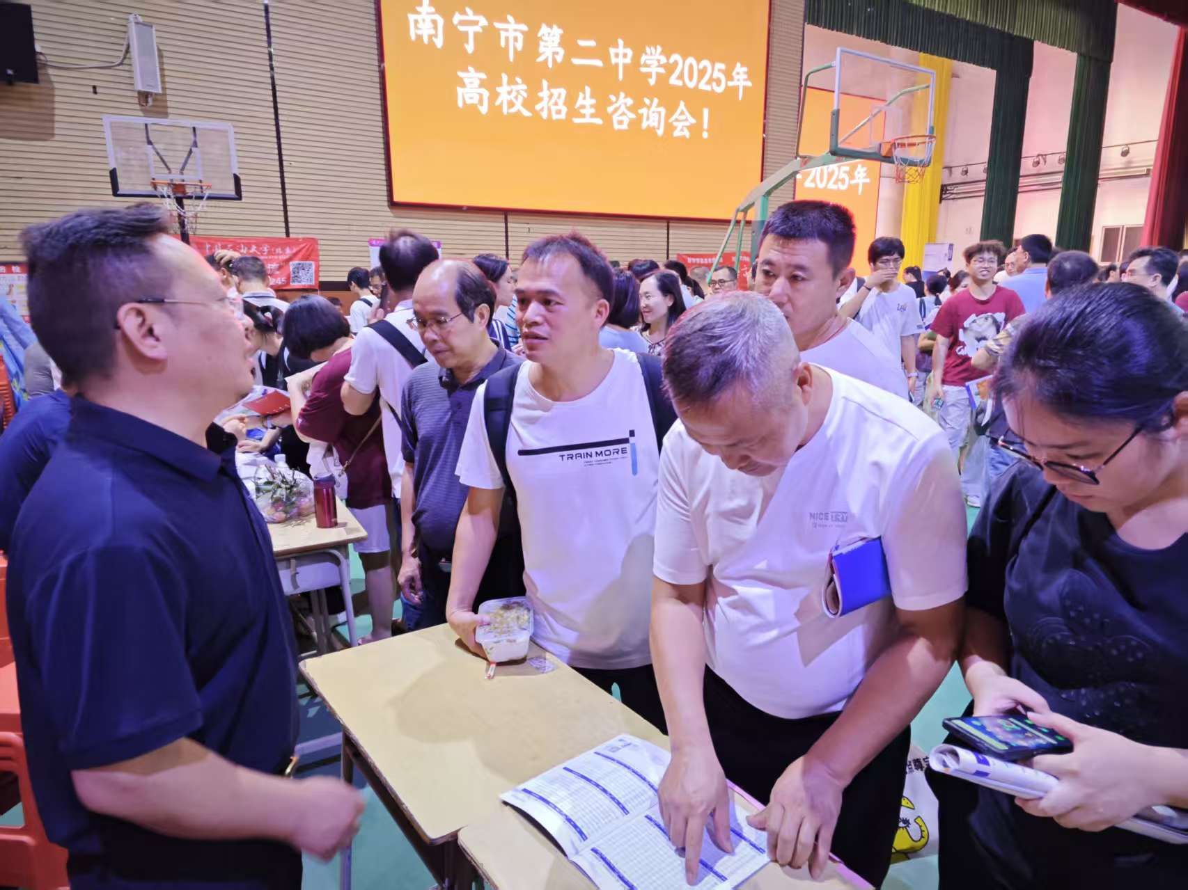 6月25日晚,南宁二中凤岭校区体育馆内,上海交通大学、四川大学、南方科技大学、香港城市大学等近百所高校齐聚招生咨询会。张维向前来咨询的学生和家长系统介绍了西南石油大学的发展历程、学科特色及科研成果,重点解读了招生政策与录取规则,针对考生关切的分数线、专业前景等问题给予详细解答。田合超围绕学院专业优势、师资力量及就业深造情况展开宣讲,通过分享学子在新能源材料领域的创新成就,激发了众多考生对相关专业的兴趣。