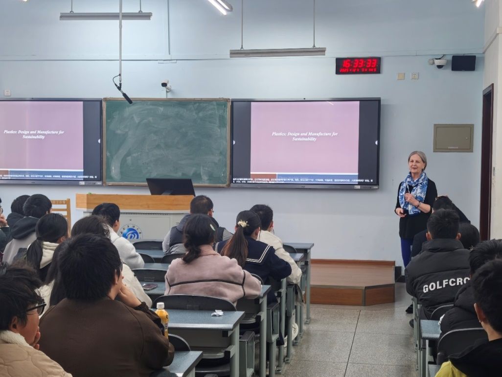 为深入推进产教融合,培养材料成型及控制工程专业本科生国际视野、提高专业素养与能力,12月5日,《材料成型及控制工程专业导论》课程组负责人向东教授邀请英国皇家工程院院士、爱尔兰工程院院士、英国阿尔斯特大学Eileen Harkin-Jones教授,为材控专业2025级本科生讲授了一堂精彩的材控专业导论延伸课。Eileen Harkin-Jones教授以“材料可持续性设计与制造”为主题,结合产业中大量的实际工程案例,以深入浅出的方式向同学们讲解了材料成型领域中可持续性设计与制造的重要意义,以及如何通过智能制造新技术降低能源与资源消耗、减少环境污染,获得了同学们的一致好评。