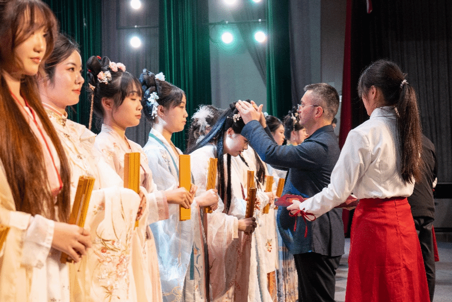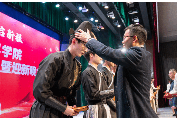 学院教师为同学们加冠加笄,并诵念古礼祝辞:“令月吉日,始加元服。弃尔幼志,顺尔成德……敬尔威仪,淑慎尔德。”这场沿袭千年的仪式,不仅是对传统文化的一次致敬,更是对青年责任的一次唤醒。随后,全体新生在优秀学生代表吴琦美带领下,面向国旗庄严宣誓,承诺肩负起家庭、社会与国家的责任。