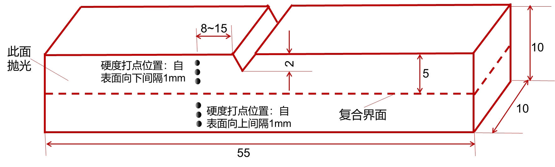 以某种材料为基板,在基板上堆焊或熔敷制作一层更强的材料,界面必须达到原子间结合,制成复合板材,参考GB/T229-2020标准进行夏比冲击测试,从复合板材中提取制作标准冲击测试试样(10×10×55mm),要求试样上的高强层厚度在5mm左右,其中包含了高强层和基板的一个侧面要加工抛光至可进行维氏硬度(加载5kg)测试的水平,试样示意图如下