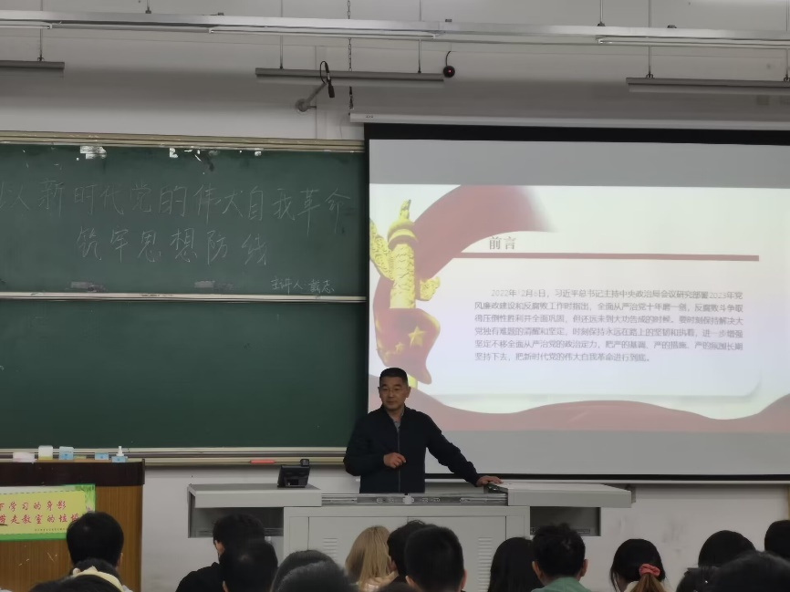 为深学细悟笃行党的二十大精神,深入开展学习贯彻习近平新时代中国特色社会主义思想主题教育,新材院分党校于2023年5月9日在明德楼A312开展2023年春季学期入党积极分子培训班专题党课。新材院党委副书记、纪委书记戴志为本期入党积极分子培训班学员作了题为“以新时代党的伟大自我革命筑牢思想防线”的专题党课,本期培训班全体学员参加。
