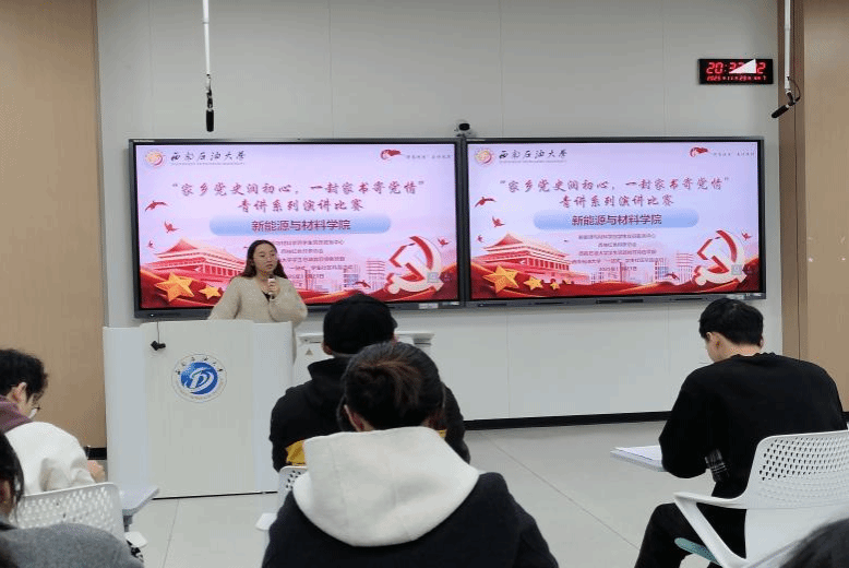 2025年11月11日晚,新能源与材料学院2025年秋季学期入党积极分子实践活动暨西南石油大学“一站式”学生社区精品活动,在思学楼A109开展。本次实践活动以“家乡党史润初心,一封家书寄党情”为主题进行演讲。学院学生党建工作指导教师杨垸钦主持。