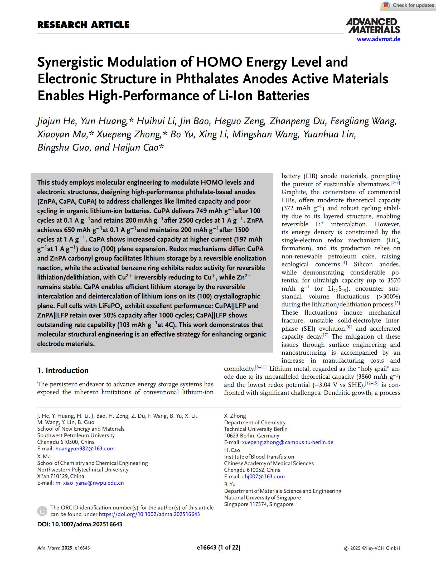 黄韵老师课题组在材料类顶级国际期刊Advanced Materials发表学术论文