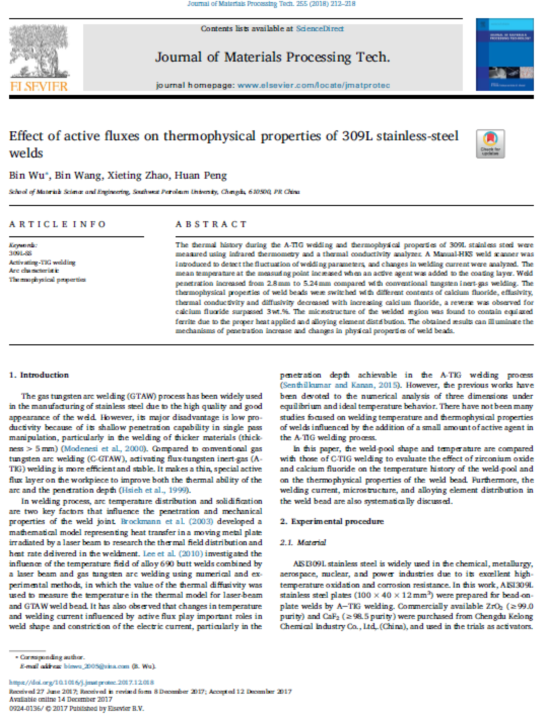 武斌老师在Journal of Materials Processing Technology杂志发表学术论文