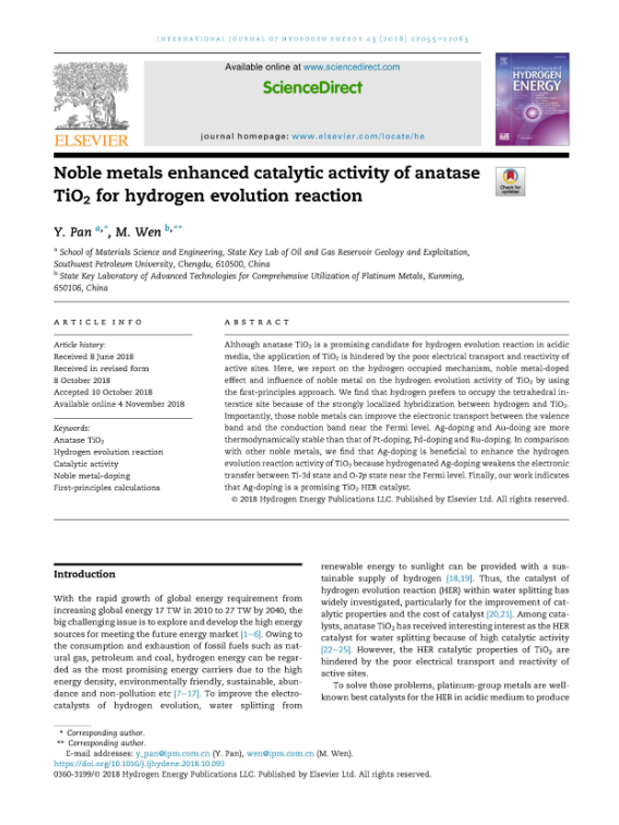 潘勇老师在International Journal of Hydrogen Energy杂志发表学术论文,影响因子:4.229。