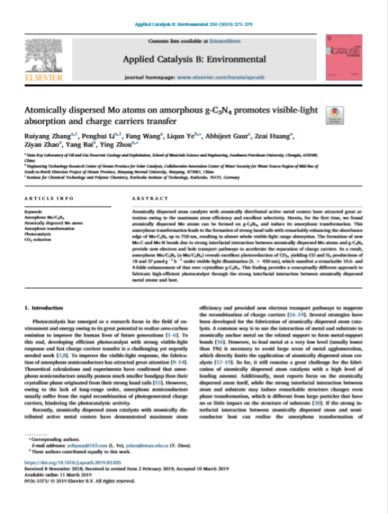 周莹教授课题组在Applied Catalysis B: Environmental杂志发表学术论文,影响因子:11.698。