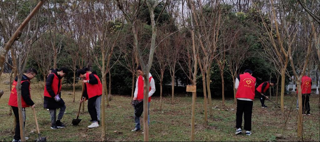二组同学前往学子林进行打扫,挖除杂草,清扫落叶。天气已经转凉,身穿红色志愿服的同学们却像一团火,让彼此不再感到寒冷。