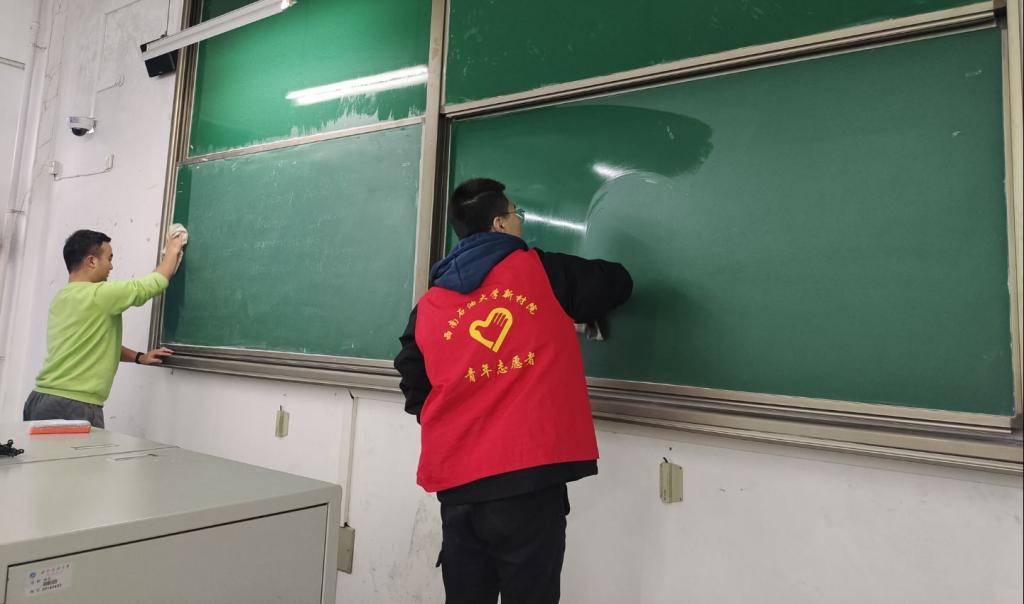 活动正式开始,一组同学对明德楼内的教室进行清扫。同学们分工有序,默契合作,擦桌子、扫地、擦黑板,相互协作,教室虽多,但志愿者们依旧不说苦,不喊累。充分发扬了勤劳能干的志愿精神。
