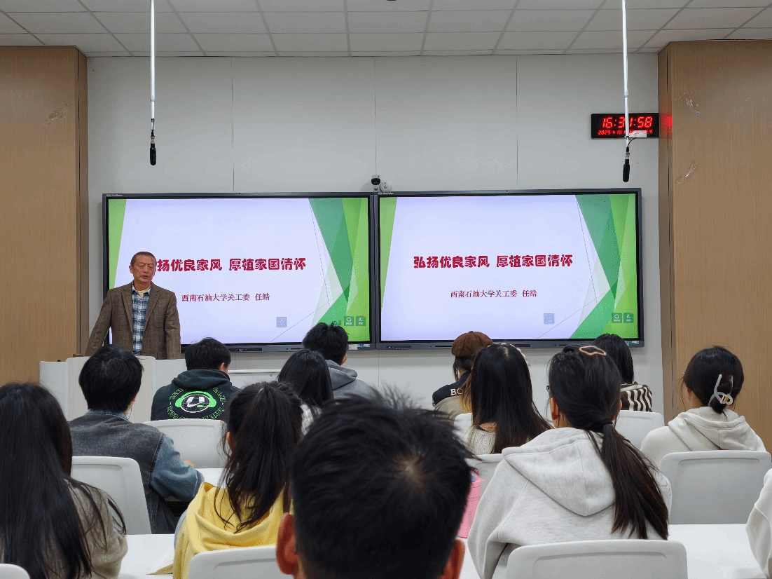 10月30日,新材院关工委在思学楼A111教室举办“弘扬优良家风·厚植家国情怀”专题讲座。西南石油大学关工委副主任、退休教师任皓教授担任主讲,新材院60余名入党积极分子参与学习。
