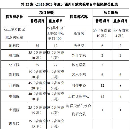 第22期(2022-2023年度)课外开放实验项目申报限额分配表