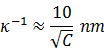 其中c为电介质的浓度,单位为mM(毫摩尔)这样,对于浓度为1 mM的盐溶液,κ-1 = 10 nm, 浓度为100 mM的盐溶液, κ-1 = 1 nm。