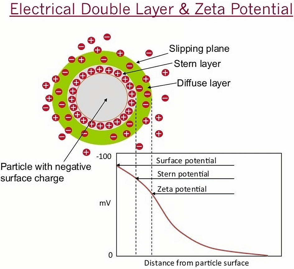 Zeta电位又叫电动电位或电动电势(ζ-电位或ζ-电势),是指剪切面(Shear Plane)的电位,是表征胶体分散系稳定性的重要指标。由于分散粒子表面带有电荷而吸引周围的反号离子,这些反号离子在两相界面呈扩散状态分布而形成扩散双电层。根据Stern双电层理论可将双电层分为两部分,即Stern层和扩散层。当分散粒子在外电场的作用下,稳定层与扩散层发生相对移动时的滑动面即是剪切面,该处对远离界面的流体中的某点的电位称为Zeta电位或电动电位(ζ-电位)。即Zeta电位是连续相与附着在分散粒子上的流体稳定层之间的电势差。它可以通过电动现象直接测定。
