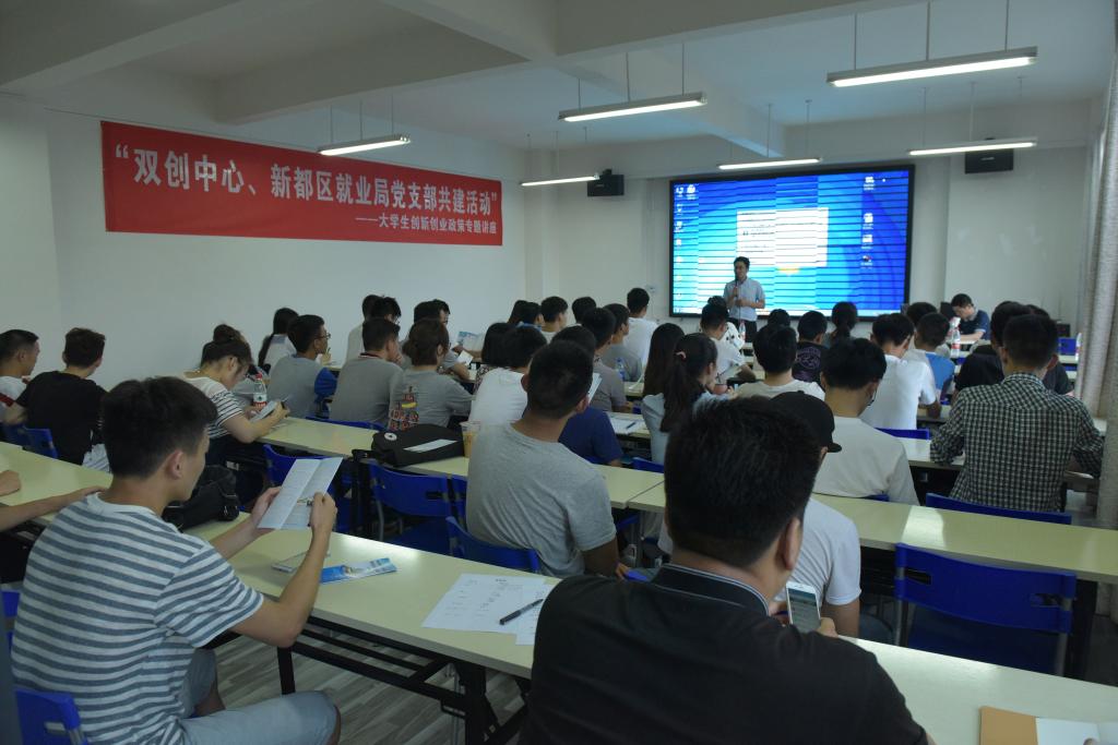 本次讲座是新都区就业局党支部和学校双创中心党支部联创联建系列活动之一。活动邀请了四川省人力资源和社会保障厅就业促进处副处长曾志刚担任主讲。就业局副局长王丽娟、就业局党支部和双创中心党支部全体党员出席了会议。会议由双创中心实践与指导服务办公室主任张磊主持。