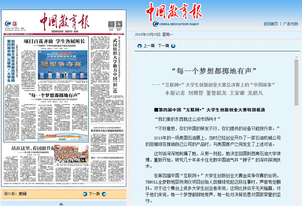 我校金奖项目负责人邢云亮凭借优异的综合表现,被选为大赛主赛道唯一代表,参加了由教育部组织,面向全国媒体进行的新闻通气会,并于会后受到人民网、中国教育报、科技日报、中国青年报的专访。中国教育报于10月15日专题报道了我校国赛银奖项目《THROLL全参数地层快测仪——油气储层快测定海神针》负责人田雅琼的创业事迹。