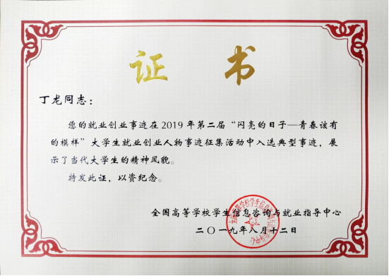 近日,教育部第二届“闪亮的日子—青春该有的模样”大学生就业创业事迹征集人物评选结果揭晓,我校马克思主义学院马克思主义理论专业2018届毕业生丁龙获评“创业人物”荣誉称号。