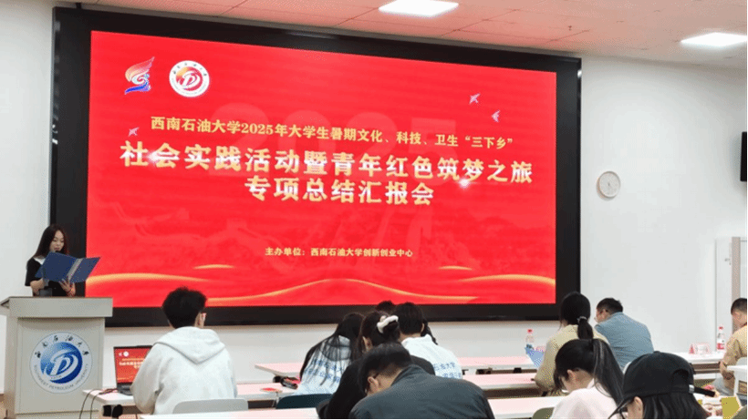 为全面回顾和总结2025年三下乡 “青年红色筑梦之旅” 专项活动的开展情况,2025 年 10 月 23 日,大学生创新创业中心在双创中心 B205 举办了西南石油大学三下乡 “青年红色筑梦之旅” 专项成果汇报展。招生就业处杨敬、教务处张旭东、大学生创新创业中心朱原三位老师担任汇报评委。