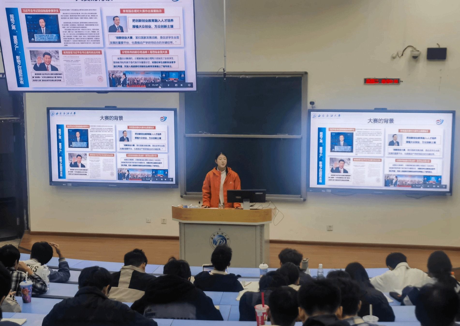活动伊始,大学生创新创业中心大赛宣讲团成员为同学们带来了一场深入细致的赛事解读。宣讲团从大赛的深厚背景出发,详细阐述了大赛对于培养学生创新能力、实践精神以及推动产学研深度融合的重要意义。在赛道设置方面,宣讲团详细介绍了不同赛道的特色与要求,包括科技创新赛道、社会服务赛道、文化创意赛道等,让同学们对各个赛道的方向和重点有了清晰的认识。对于评审标准,宣讲团从创新性、实用性、商业性、团队情况等多个维度进行剖析,并以过往优秀项目为例,深入讲解了每个维度的具体考量因素,使同学们明确了努力的方向。在备赛策略环节,宣讲团分享了如何选题、如何组建高效团队、如何进行项目规划和时间管理等方面的实用技巧,为同学们提供了系统的备赛指导。