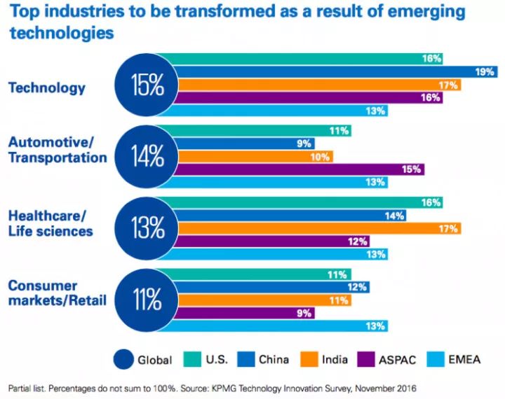 日前,毕马威(KPMG)全球调研了841 位企业高管(其中90位来自中国),发布了2017年颠覆性技术变革趋势报告。