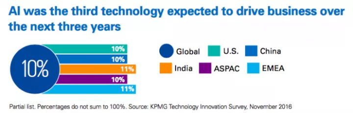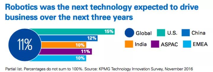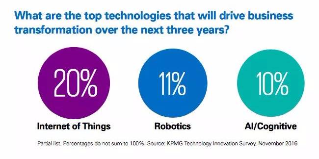 在“未来三年将推动商业转型的最重要的技术是什么?”这一问题中,毕马威调研了全球841位高管,共有20%的受访者选择了物联网,11%选择了机器人,而10%则选择了AI。