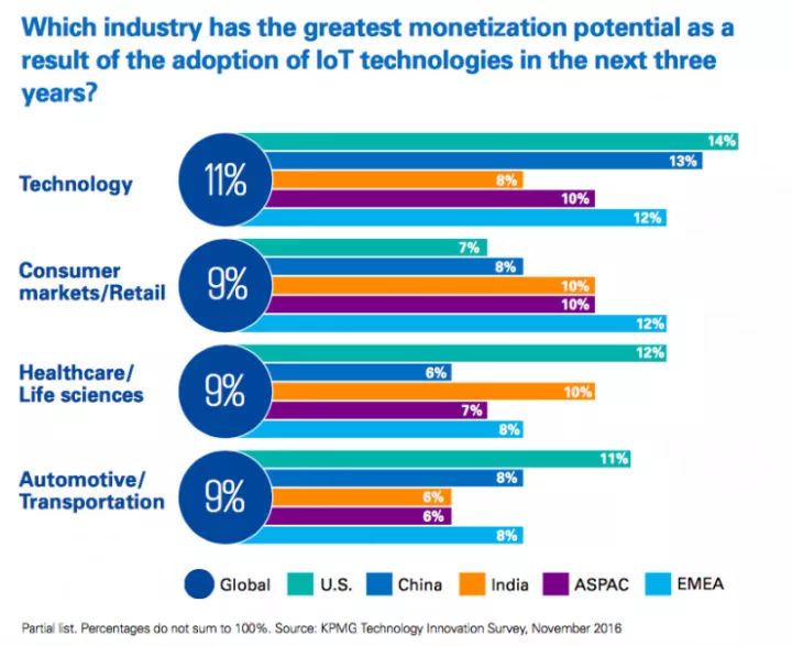 在被问及“未来三年哪些行业因采用IoT技术而拥有最大的货币化潜力?”时,这些科技行业的高管更看好科技领域的物联网货币化潜力。