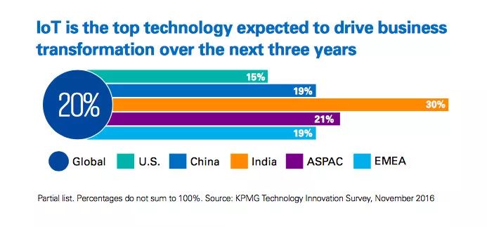 在毕马威的这次科技创新调查中,物联网在亚洲地区获得高分。其中,印度、韩国、中国和日本的占比分别为30%、25%、19%和18%。