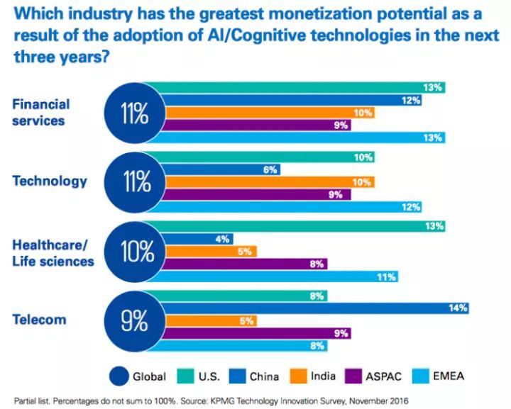 那么,未来三年有哪些行业因采用AI技术而拥有最大的货币化潜力?如上图所示,在毕马威针对这一问题的调研中,金融服务和技术两个行业居首位,各占比11%,医疗/生命科学居其次,占比10%,而电信行业则占比9%,排第四。