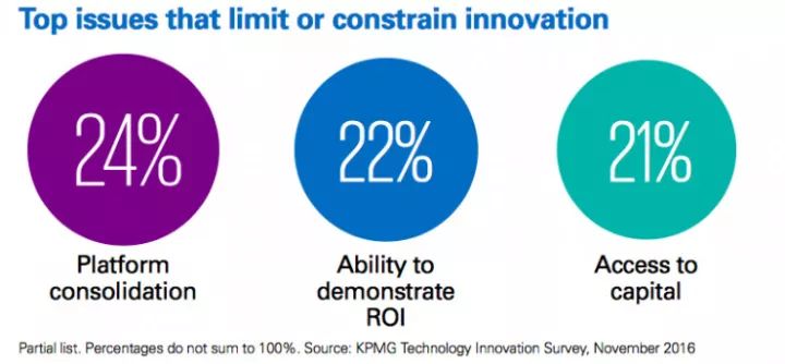 据毕马威调查结果显示,平台整合、投资回报率和获得资本是限制或阻碍创新的三大要素,占比分别为24%、22%和21%。虽然获得资本的比率与去年大致相同,但平台整合和投资回报率(去年为14%)均有所提升。