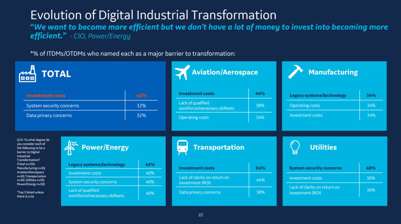 42%的决策者将投资成本视为IIoT转型的主要障碍。排在第二位的是安全问题和数据隐私问题之间的双向关系,每个关键部分为32%。对于ITDMs/OTDMs来说,他们所认为的数字化转型中遇到的主要障碍: