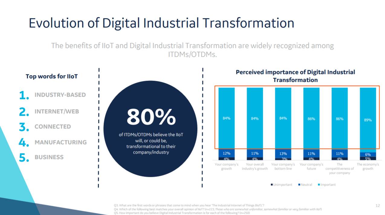 IIoT和数字产业转型的好处得到了ITDMs/OTDMs的广泛认可,产业基础、互联网、连接、制造业和业务也成了IIoT的热点词汇。此外,80%的ITDMs/OTDMs认为,IIoT将会带动他们公司的转型。