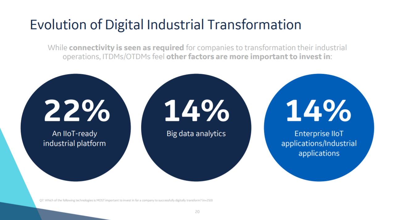 尽管互联互通被视为企业数字化转型最必要的条件,但ITDMs/OTDMs依然认为,还有更重要的因素需要引起注意,并做出相应的投资,包括平台、大数据分析和IIoT应用程序/工业应用。