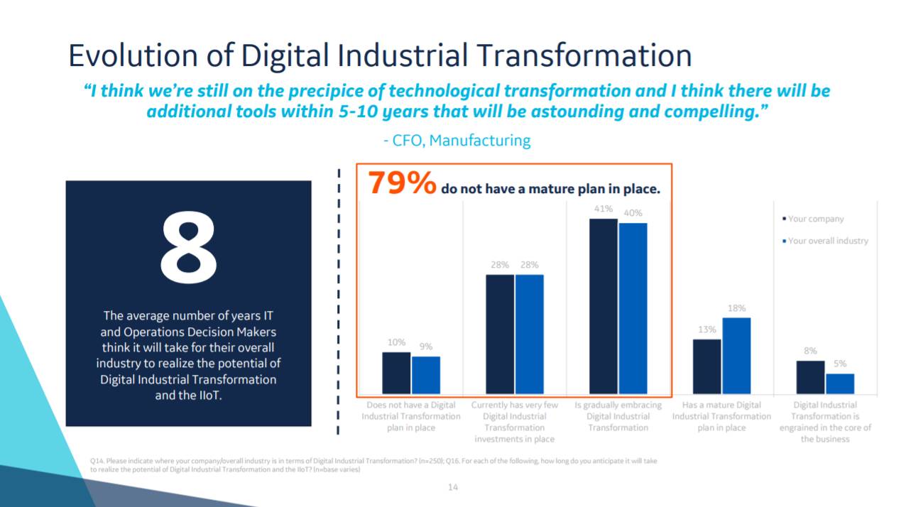 大多数决策者认为,让整个行业意识到数字化转型和IIoT的潜力还需花上几年的时间。79%的企业目前仍没有一个成熟的计划。