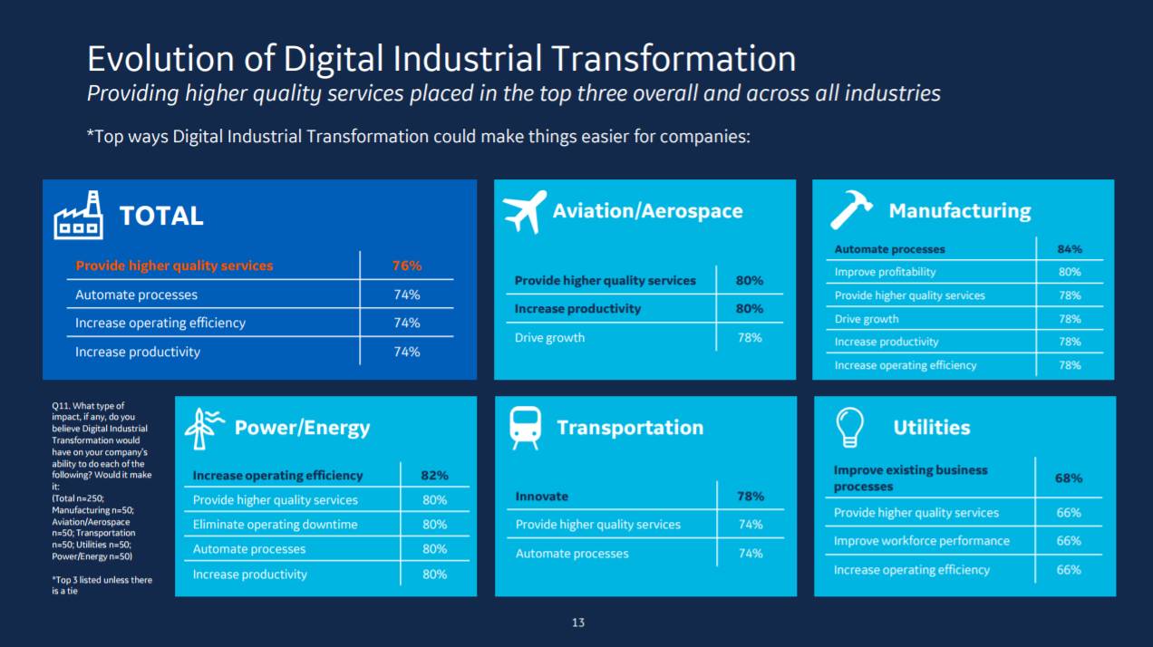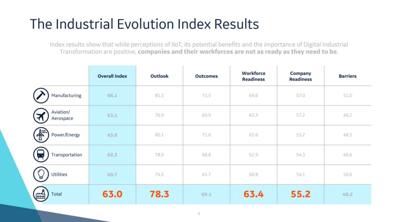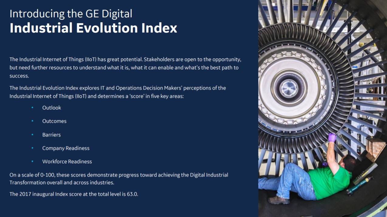 近日,GE Digital发布了一份新的报告,该报告研究的是工业物联网(IIoT)相关的数字化转型现状,报告用数字化产业发展指数来描述这一现状。该指数是基于对全美五个行业中的250个企业决策者的调查而得出的,包括了制造业,航空/航天,电力/能源,交通运输和公用事业五个行业。