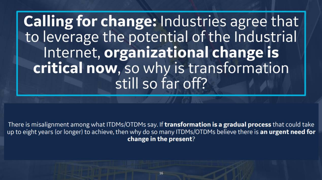 呼吁变革:虽然整个行业一致认为,利用IIoT的潜力组织变革至关重要。可是为什么数字化转型看起来仍然如此遥远呢?关于这个问题的答案,在ITDMs/OTDMs中虽然存在一定的偏差。关于IIoT,有一个共识,即这是一个循序渐进的过程,可能需要长达8年(或更长)才能实现,同时对于企业来说也是一项迫切的任务。