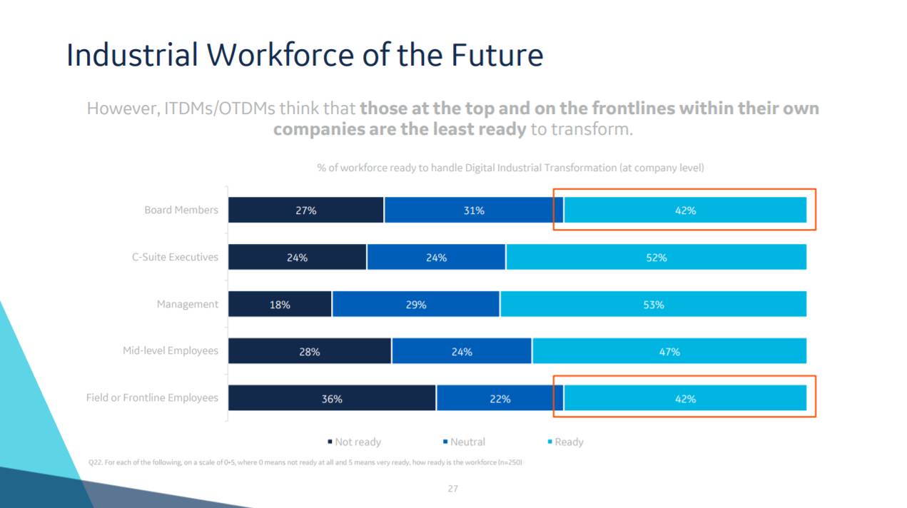 然而,在ITDMs/OTDMs看来,企业内部的领导层和一线员工在数字化转型方面,是最没有做好准备的群体。董事会和一线员工做好迎接IIoT到来的均只占比42%。