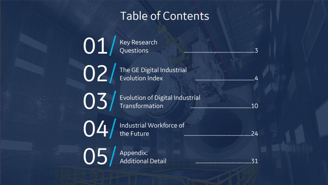 整份报告分为五大部分:重点研究问题、GE Digital发展指数、数字化转型发展、未来的工业劳动力以及附录。