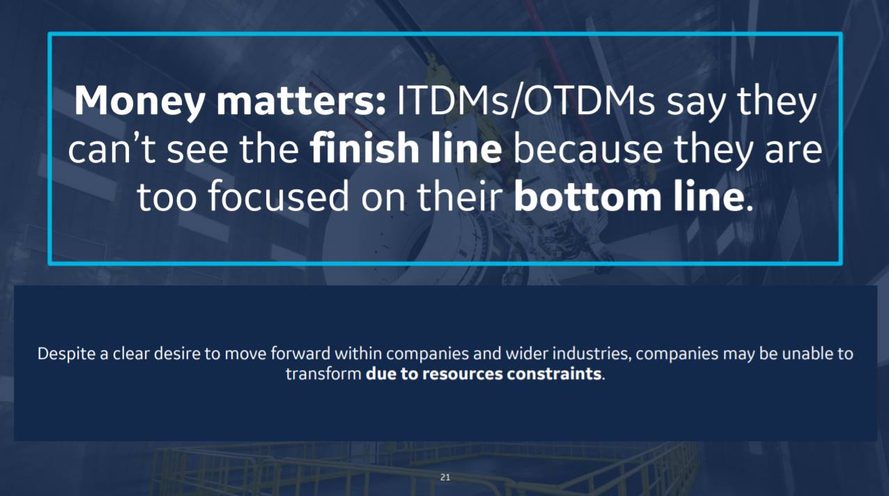 资金是重中之重:ITDMs/OTDMs表示,他们暂时无法预测IIoT最终发展情况,他们目前更专注于自身的发展现状。尽管某些企业有明确的意愿在企业内部及行业中积极推进IIoT,但由于资源的限制,企业或将无法实现转型。
