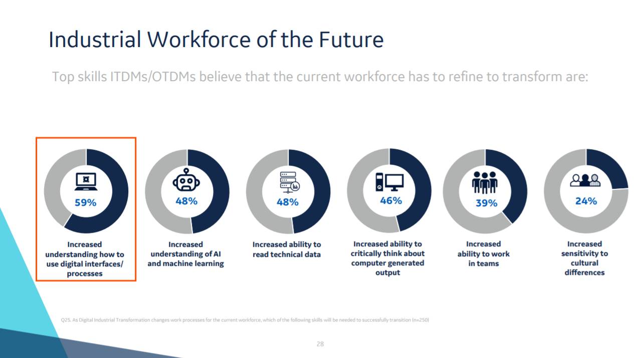 在ITDMs/OTDMs看来,当前一线员工是最迫切改进的技能包括:增进了解如何使用数字接口/流程、增进对人工智能和机器学习的理解、提高读取技术数据的能力、提高批判性思考计算机生成输出的能力、团队协作能力的提高、对文化差异的敏感性增强