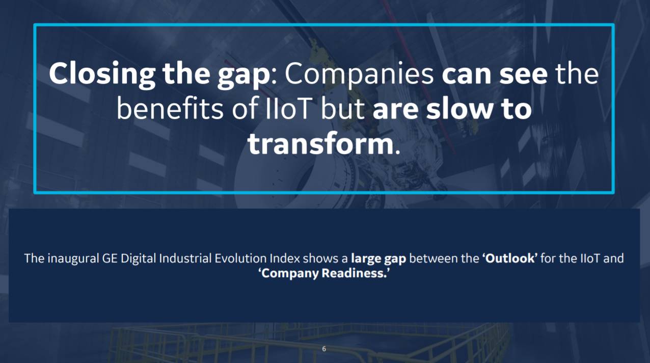 缩小差距:企业虽然可以看到IIoT发展所带来的巨大好处,但转型这一过程却是非常缓慢的。GE Digital的《数字化产业发展指数》显示,在发展IIoT方面,“企业准备情况”与“前景”这两个指数之间其实存在着巨大的鸿沟。