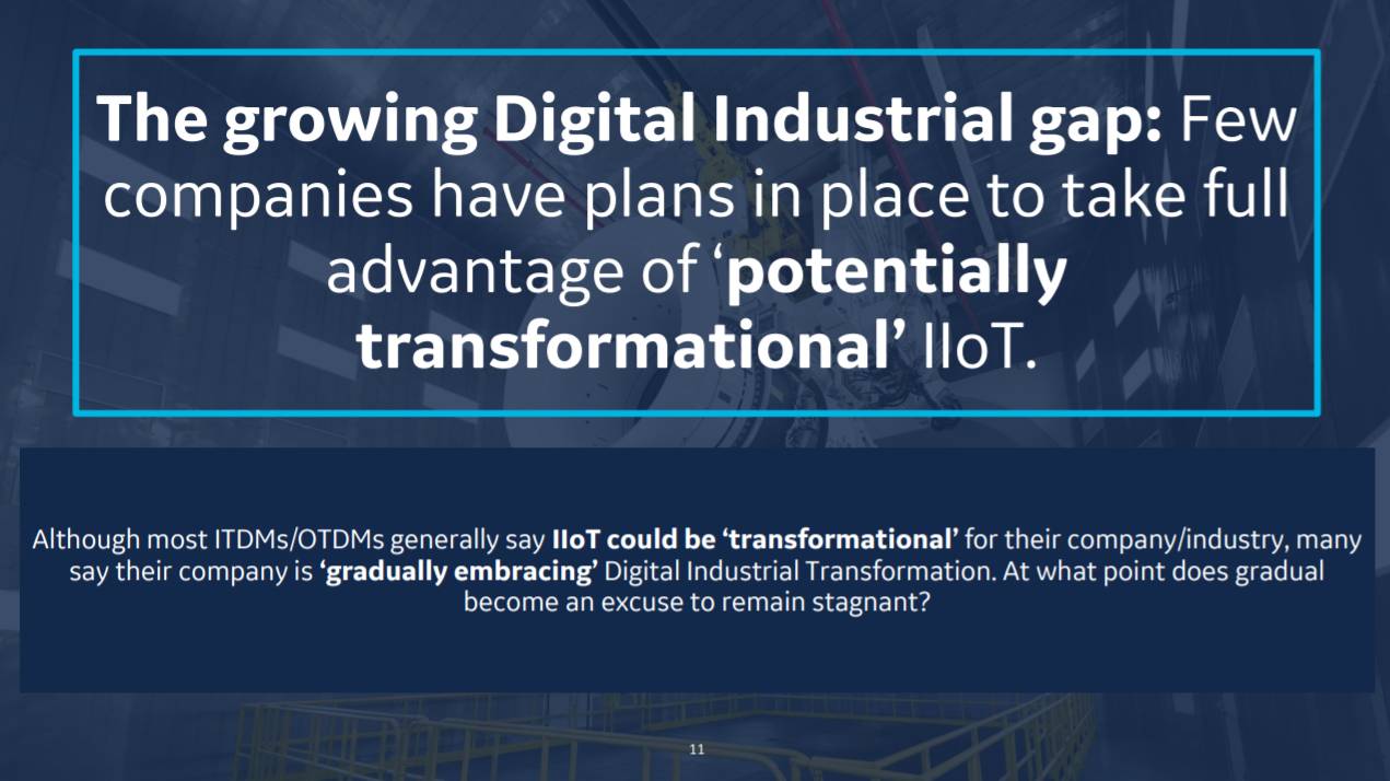 日益增长的数字产业鸿沟:大部分企业没有制定可以充分发挥效用的转型计划。尽管大多数ITDMs/OTDMs都表示,站在企业或者行业的角度来看,IIoT是一个转型的好时机。但是他们也清楚的认识到,他们的公司目前还只是处于“逐渐接受”数字产业转型的阶段。至于什么时候才能真正实现转型依然是个谜!