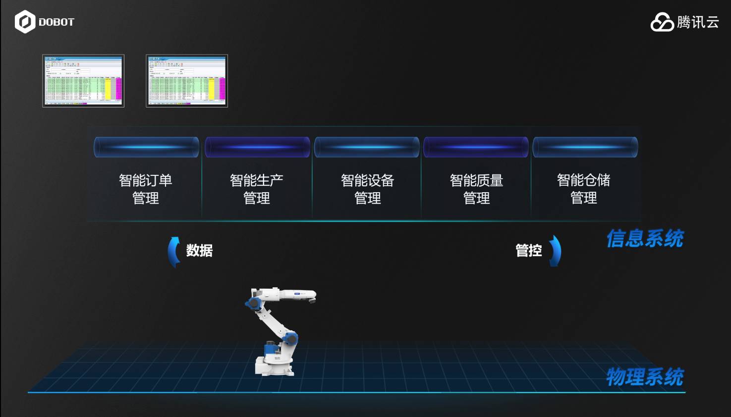这次越疆科技联合腾讯云将要落地开发的智慧化工业管理系统——DobotCyber将主要解决制造类企业信息化低、自动化少、人才匮乏、产品管控能力差等一系列问题。
