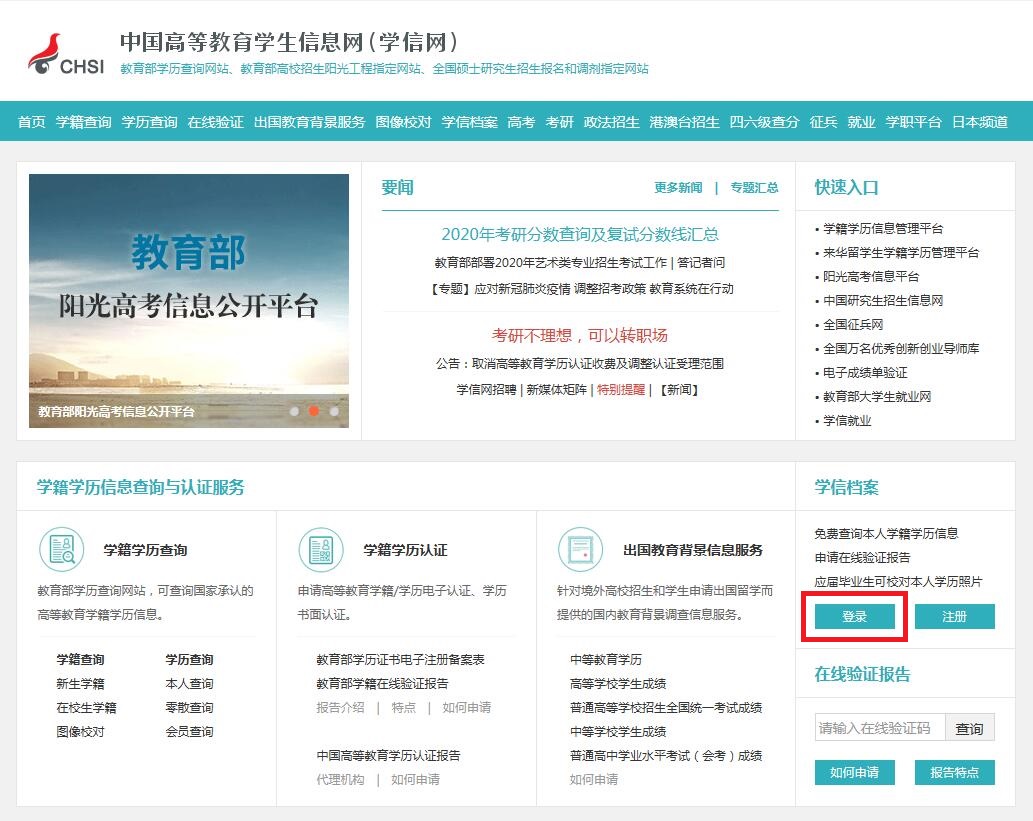 第一步:进入“中国高等教育学生信息网(学信网)”首页界面图1。