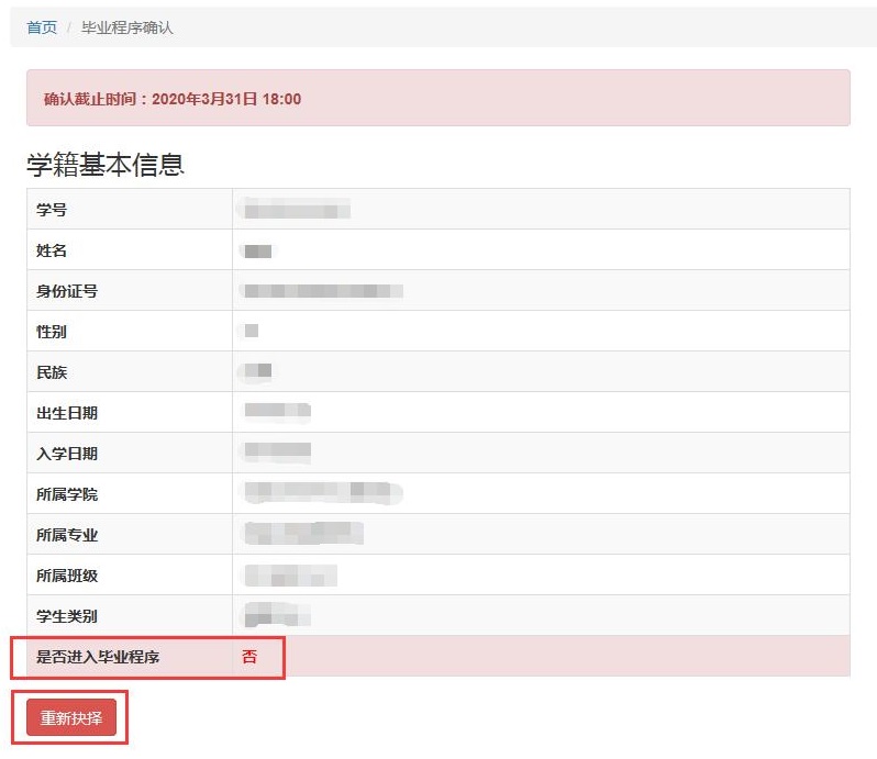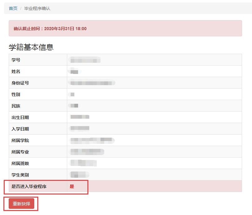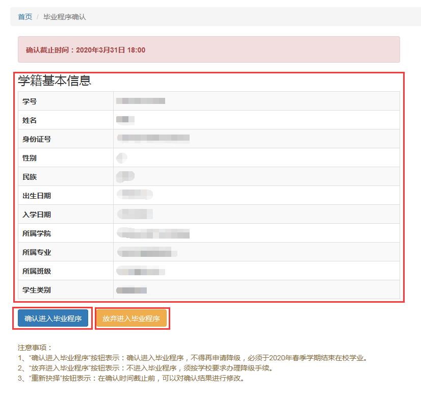 4.学生是否进入毕业程序确认时间为2020年3月19日09:00至2020年3月31日18:00,确认结果以截止时间数据为准,逾期未确认的学生一律按不进入毕业程序处理。