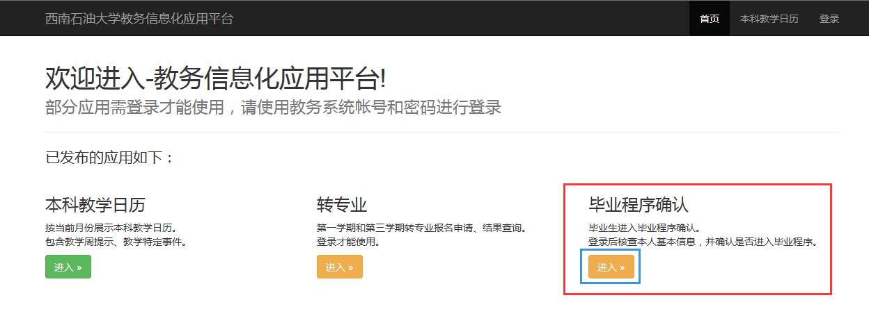 3.学生是否进入毕业程序确认统一在“西南石油大学教务信息化应用平台”进行,具体操作说明见本通知附件2。