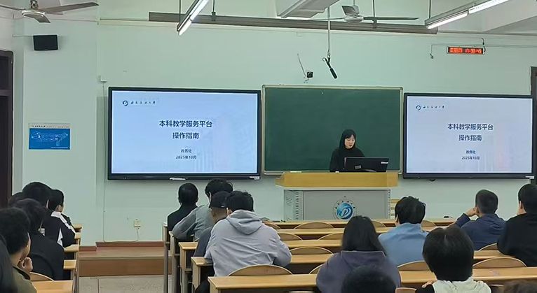 学籍科科长王飞从学业预警的设立目的、核心政策、学业规划方法等方面进行了细致解读,帮助同学们深刻理解预警制度的内涵和意义,进一步认识到科学规划学业的重要性。学籍科符晓老师聚焦本科教学服务平台的学业管理与监测功能,重点演示了培养方案、选课与成绩管理、学业监测等核心业务功能,让同学们能够借助信息化手段督促自己专心学习。