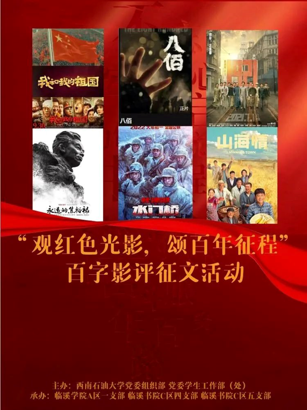 以史为鉴,可以知兴替,以人为鉴,可以明得失。无数影片记载了岁月长河中坎坷而又光辉的事迹,在光影交替中闪烁着红色的光芒。近日,石油与天然气工程学院临溪书院A区一支部举办了 “观红色光影,颂百年征程”百字影评征文活动。此次活动中,同学们观看爱国题材影视作品,拍摄观影照片记录,并撰写百字影评文章,用真切感悟描绘了一幕幕鲜活的画面,于“帧帧英雄豪情”中,感悟革命前辈和新时代楷模的无畏精神与奋斗精神,书下“字字当今壮志”。