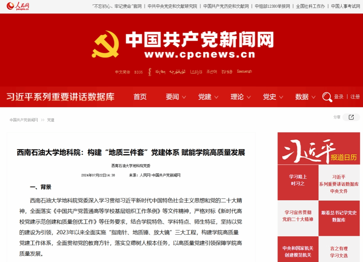 该体系自2023年实施以来,地科院切实将党的政治、组织优势转化推动学院高质量发展的强大动力。党建思政工作得到人民日报、光明网、中国教育报等国家级媒体报道。获批四川省党建标杆院系培育单位、四川省高等学校课程思政标杆院(系)、四川省高校思政精品项目等,荣获四川省高校先进基层党组织、四川省优秀党务工作者、中国青年志愿服务大赛银奖、全国高校毕业生基层就业卓越奖等。(作者:上官晴天 史格)